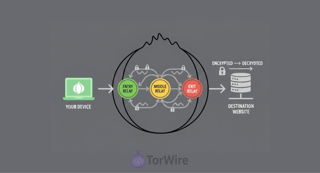 Tor maintains privacy by routing your traffic through a series of volunteer-run Tor nodes via a process called onion routing. Instead of connecting directly to a website, your data travels through a circuit of at least three of these randomly selected relays.