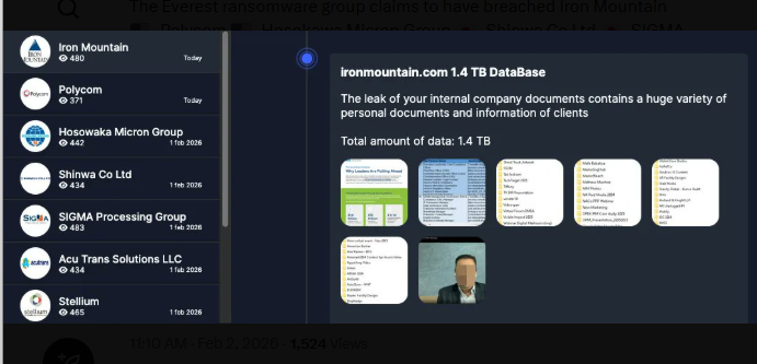 Everest claims it stole 1.4 terabytes from Iron Mountain. The data reportedly includes internal documents and client information. As proof, the hackers posted screenshots of folder names. These names suggest client data was exposed.