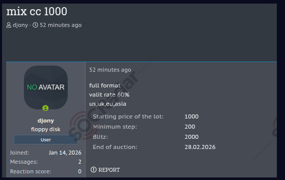 A threat actor listed 1,000 credit cards for sale on the dark web, claiming 60% of cards are valid. Said offer will run for a month and is valid until February 28.