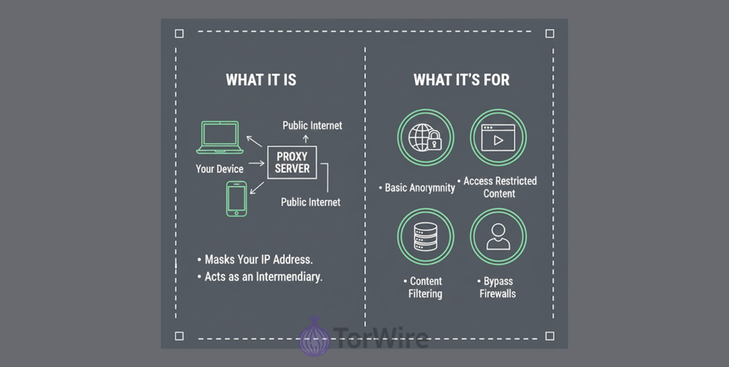 A proxy server is a simple intermediary. It sits between you and the website you are visiting. Its job is to serve as a go-between, resolving your web requests to a website.