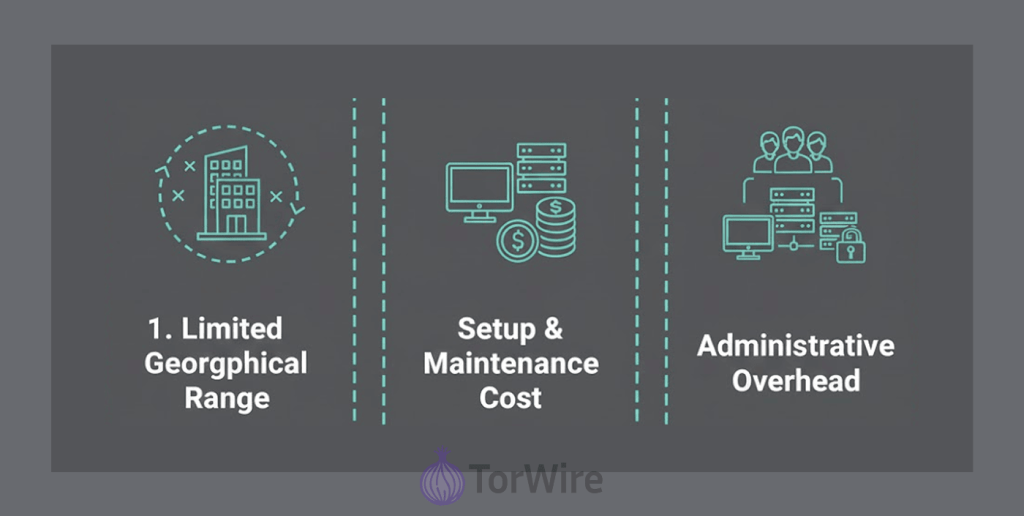 - Limited geographical range: A LAN is intended to cover just a small physical area. Connecting a few buildings located across town will require a different solution (like a WAN – Wide Area Network, typically with leased lines or VPNs).